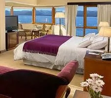 The 5-star Llao Llao Resort is located in the mountains of Nahuel Huapi National Park, next to the lake. Its 18-hole golf course, conference rooms, restaurants, and full spa make this resort a destination in itself, perfect year-round for skiing in winter or water sports in summer. There are 205 guest rooms, all with traditional Patagonian decor, and outfitted with minibar, cable TV, safe box, and more. Some rooms have mountain or lake views, and there are also full 2-bedroom cabins available.