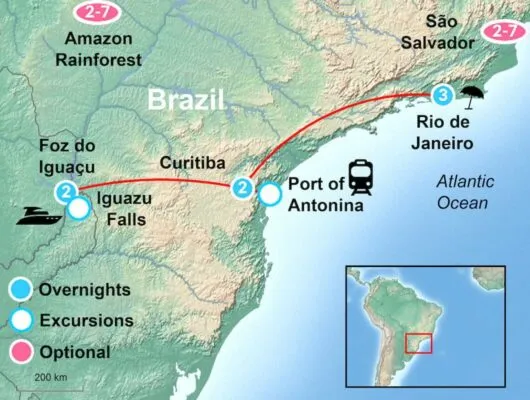 To extend your Brazilian adventure, consider adding a 3-day trip to Salvador in Bahia to experience the rich Afro-Brazilian culture of the country’s original capital, or venture into the Amazon Rainforest for a 3-day river cruise.
