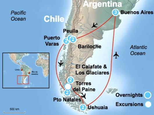 15 Days / 14 NightsPatagonia is shared by Argentina and Chile, the two southernmost countries in South America divided by the towering Andes. During this 2-week tour, learn about their distinctive culture, a merge between native American culture and traditions brought by 19th-century immigrants from Germany, Wales, and other parts of Europe. Admire the landscapes of Chile’s Torres del Paine National Park, and Los Glaciares and Tierra del Fuego National Parks in Argentina, all of them during this 15-day tour.